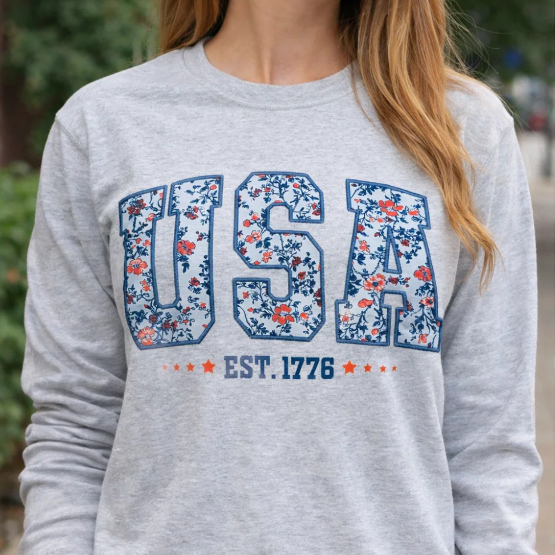 Celebrate 250 years of our country in patriotic style with a feminine twist in our USA Floral Graphic Long Sleeve Tee. This cozy heather gray long sleeve features bold varsity-style USA lettering filled with a delicate red and navy floral print, giving it the perfect blend of classic Americana and boutique charm. The design is finished with “EST. 1776” and star accents, making it an ideal piece for Memorial Day, the 4th of July, Labor Day, or everyday patriotic style.